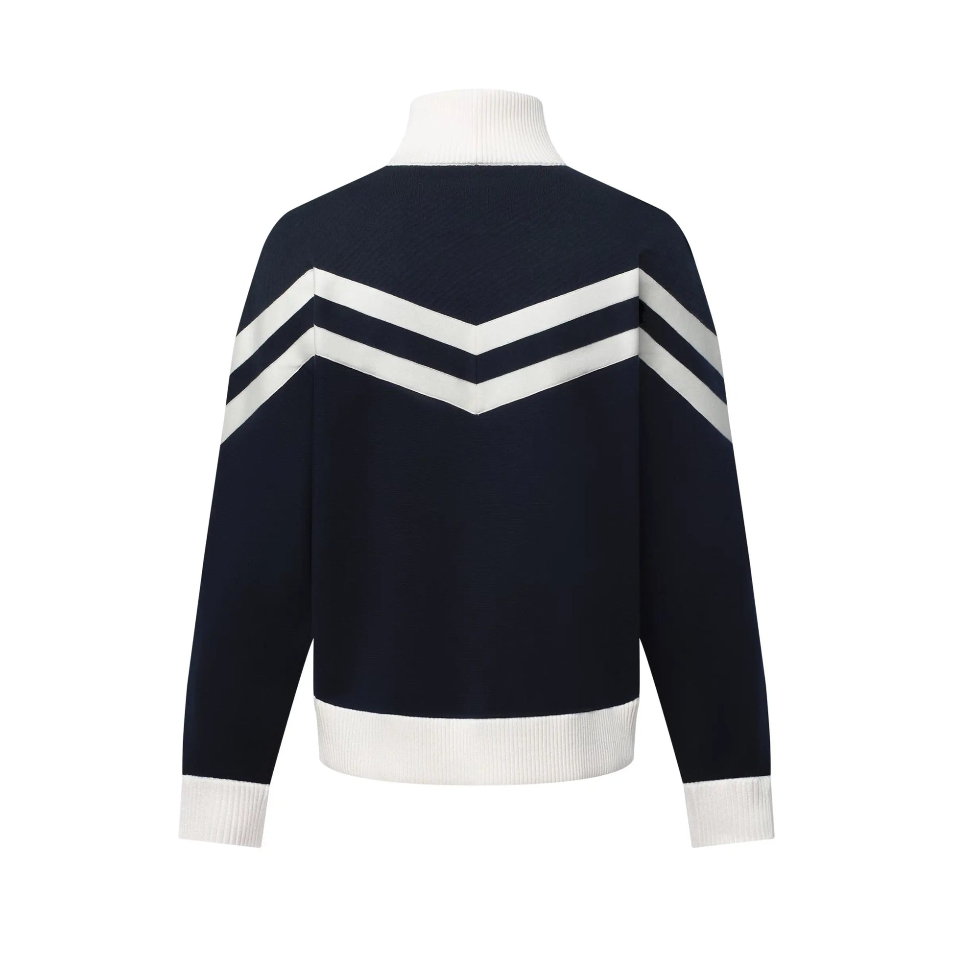 Ce blouson nautique en maille de coton revisite une silhouette sportive classique avec des détails éminemment raffinés et un design contemporain. Des bandes blanches en maille contrastée créent un motif inspiré des uniformes des marins sur la partie supérieure et les manches, conférant à la pièce une allure élégante et décontractée. La coupe est standard, assurant une silhouette facile à porter.