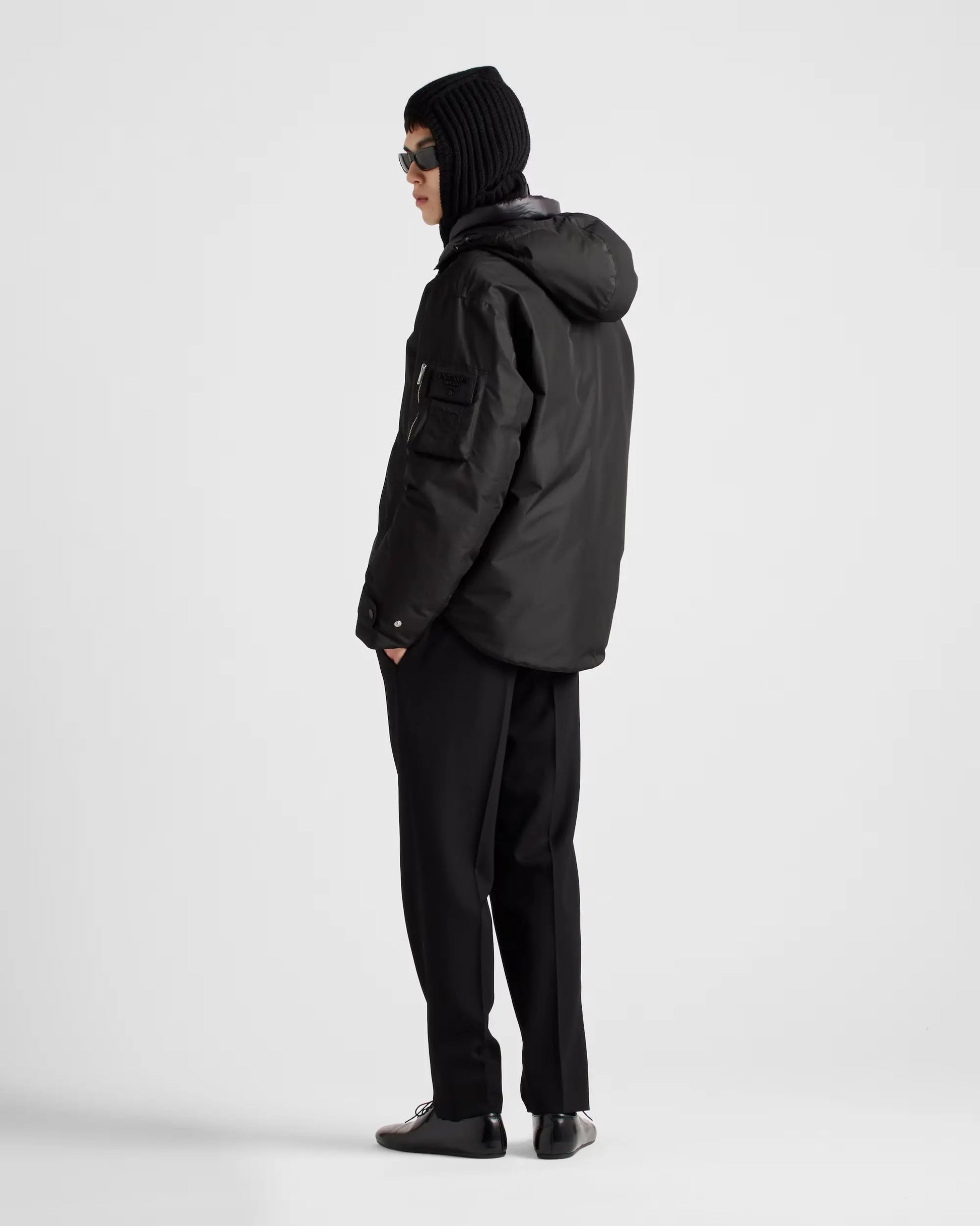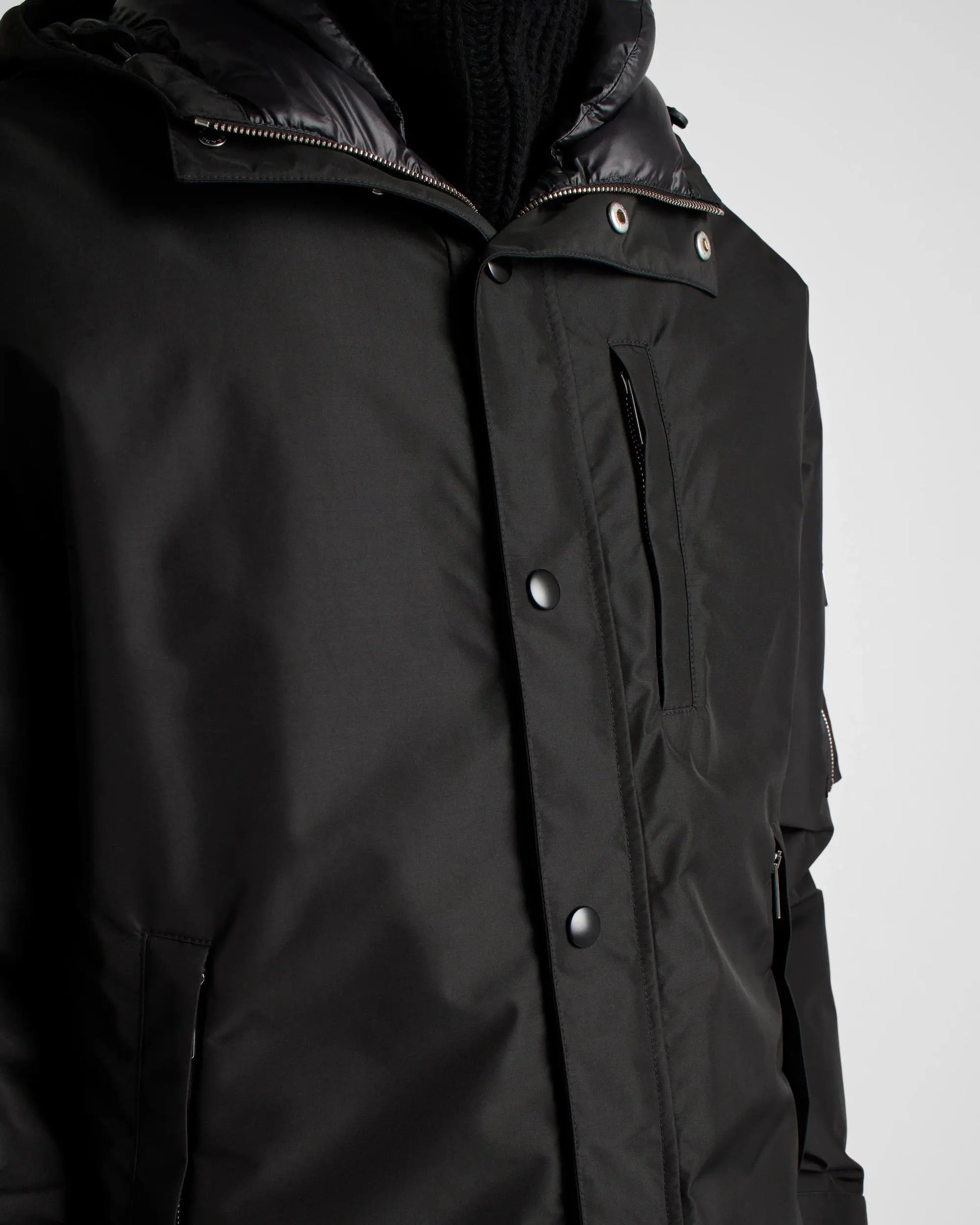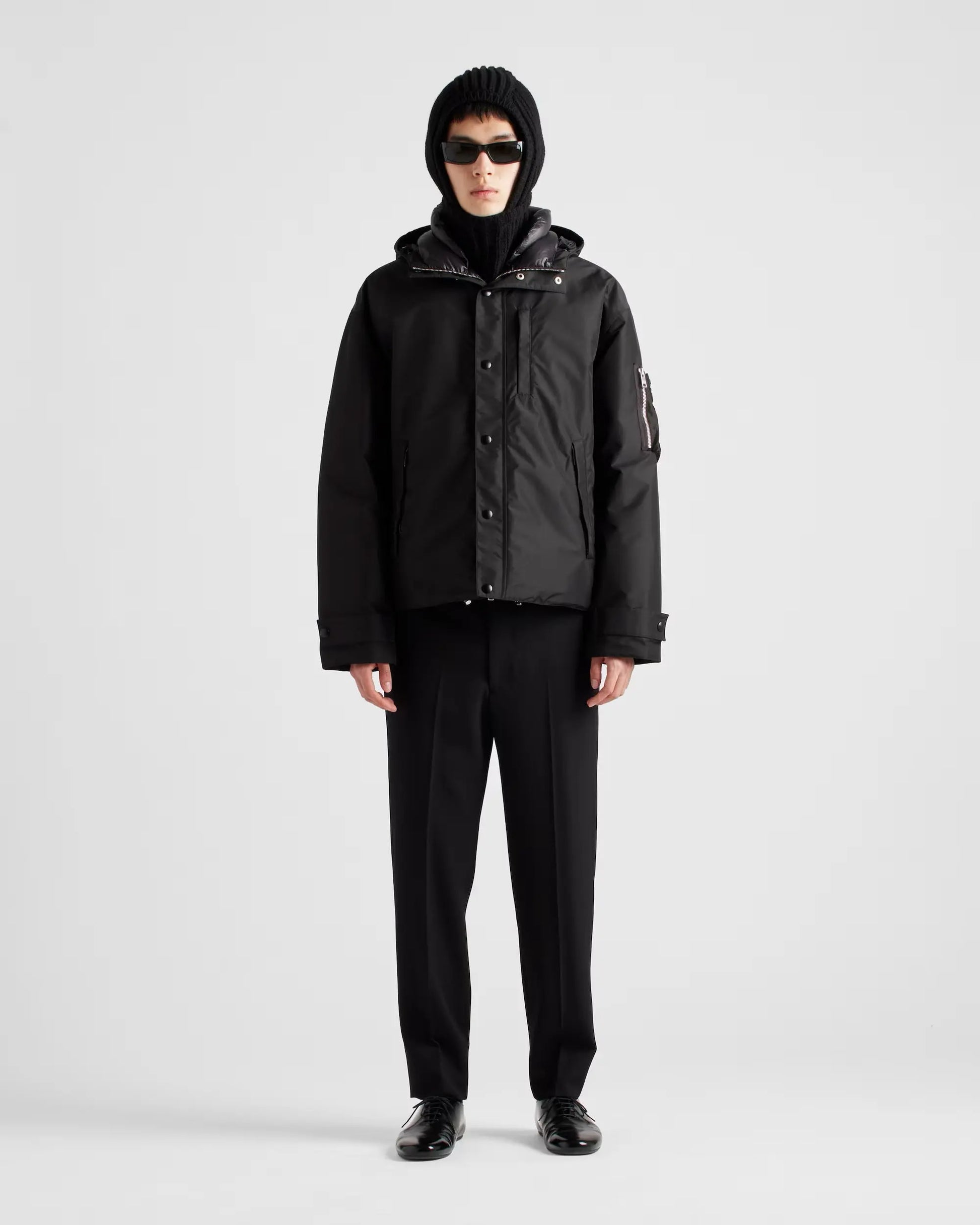 Elle intègre de nombreux éléments pratiques conçus pour le confort et la protection, tels qu'une fermeture à glissière et boutons-pression, des poches passepoilées zippées, et des poignets élastiqués avec bride. L'esthétique est affirmée par des épaules tombantes, un ourlet arrondi au dos, et un cordon de serrage élastique, soulignant l'allure moderne. Le logo lettres discrètement apposé sur la manche confirme l'identité de la Maison.