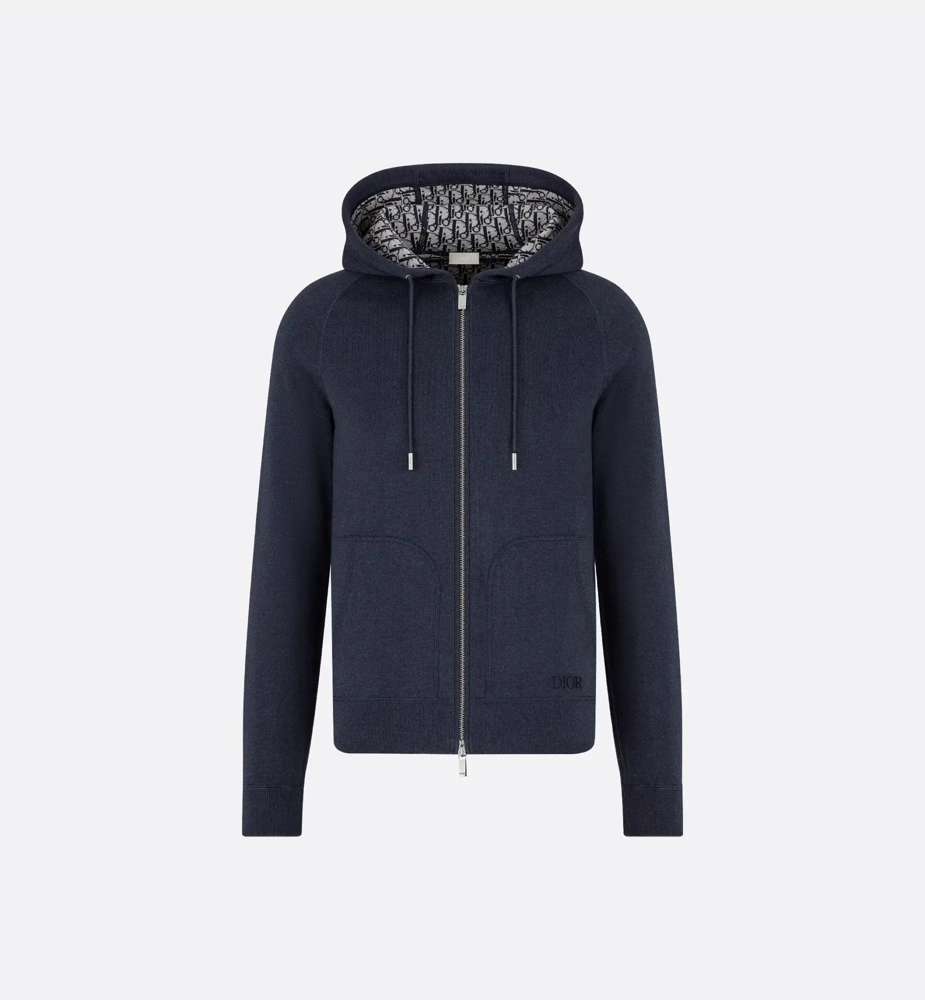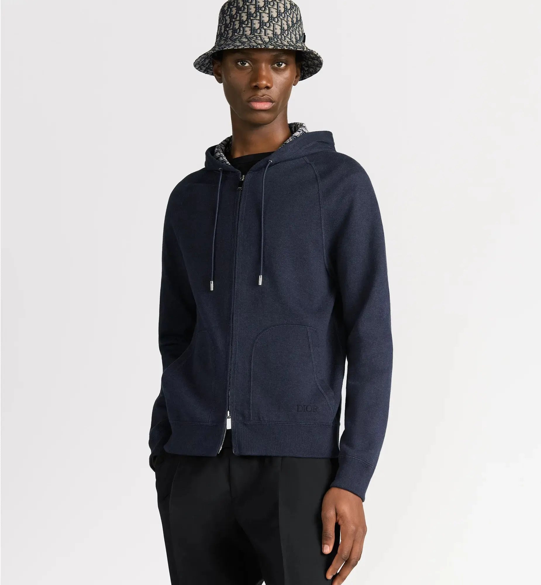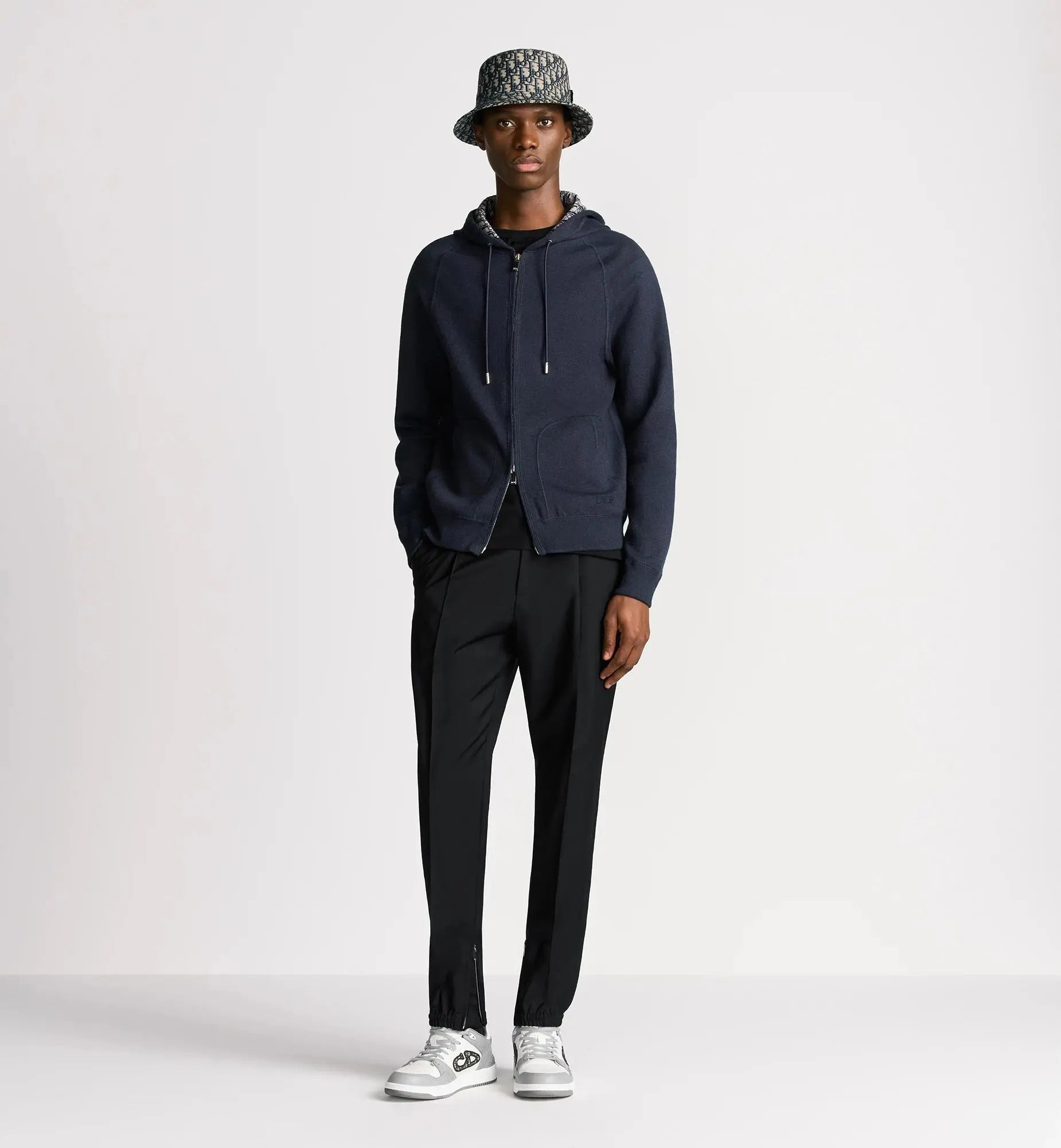 La veste est sublimée par une broderie Dior à l'avant et se distingue par son intérieur en jacquard Dior Oblique qui habille subtilement la pièce. Elle dispose d'une capuche avec cordon de serrage aux embouts gravés, de manches raglan et de poches plaquées. Le pantalon assorti reprend les mêmes codes avec sa broderie ton sur ton et son intérieur jacquard, complété par une taille et des chevilles côtelées pour une silhouette moderne et structurée.