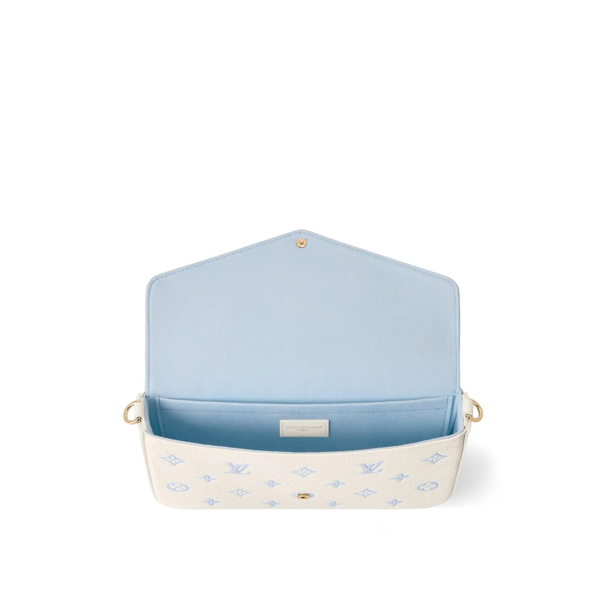 Issue de la collection Sweet Escape, cette pochette Félicie se distingue par son élégant jeu de contrastes blanc lait et bleu, apportant une touche fraîche et moderne à ce modèle iconique. Confectionnée en cuir Monogram Empreinte embossé, elle allie raffinement et praticité. Son format compact renferme deux poches amovibles pensées pour une organisation optimale, tandis que sa chaîne dorée coulissante et amovible offre plusieurs options de porté, à l’épaule, en crossbody ou à la main.