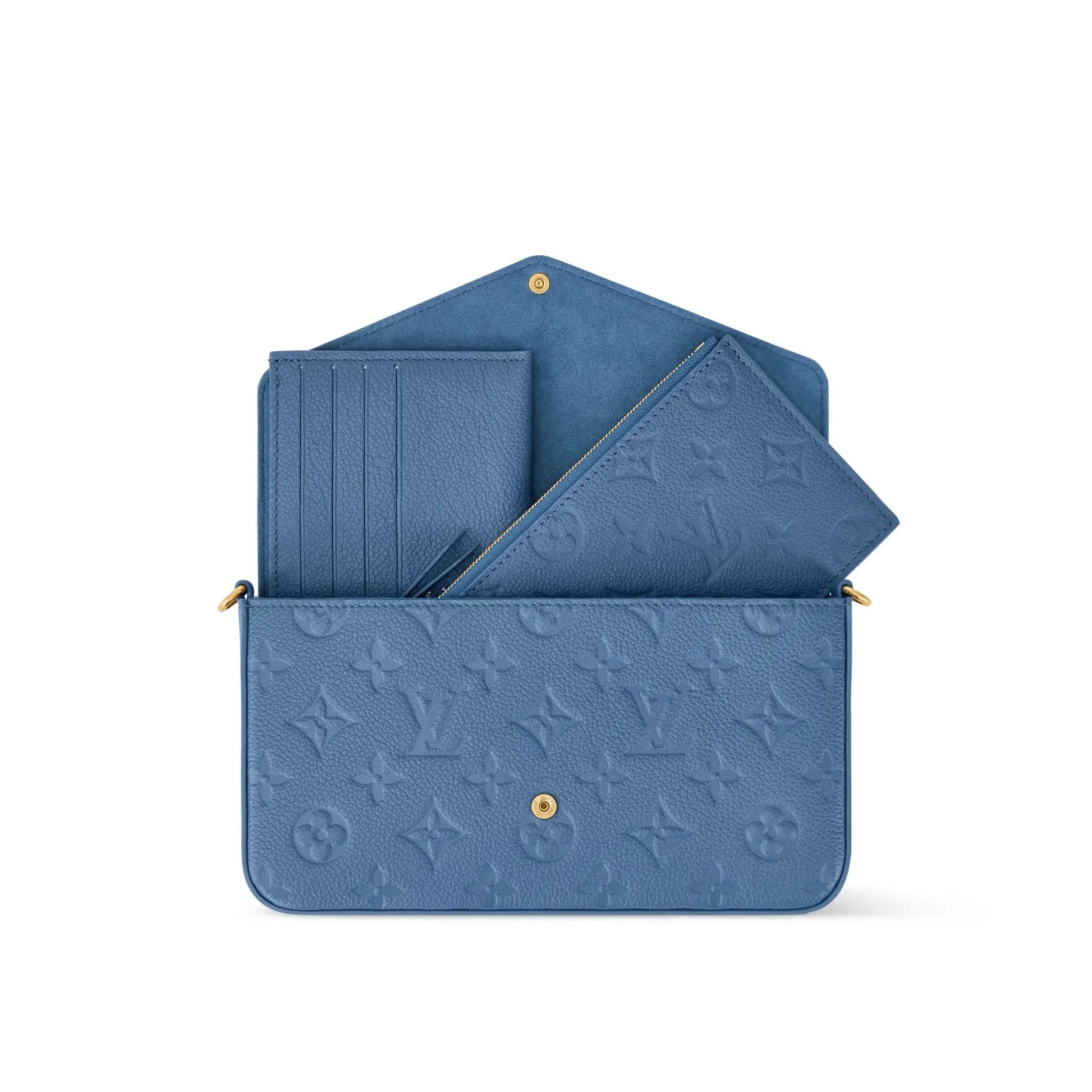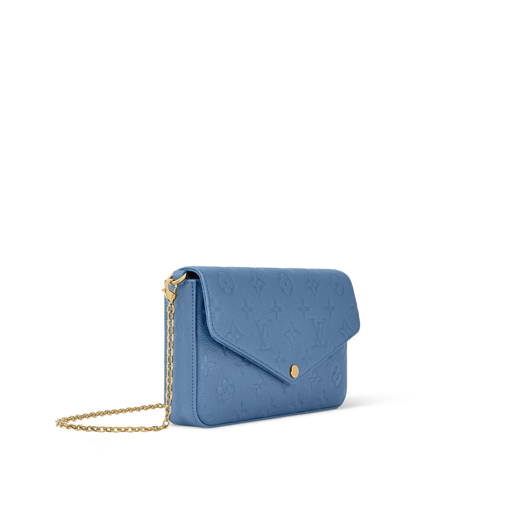 Parfaite pour accompagner les escapades urbaines, cette pochette Félicie se décline cette saison dans une élégante teinte Bleu Denim intemporelle. Réalisée en cuir Monogram Empreinte embossé, elle séduit par son allure à la fois chic et fonctionnelle. Sa chaîne dorée amovible permet de la porter à l’épaule, en crossbody ou à la main, tandis que son intérieur bien pensé accueille facilement les essentiels du quotidien grâce à ses deux poches détachables.