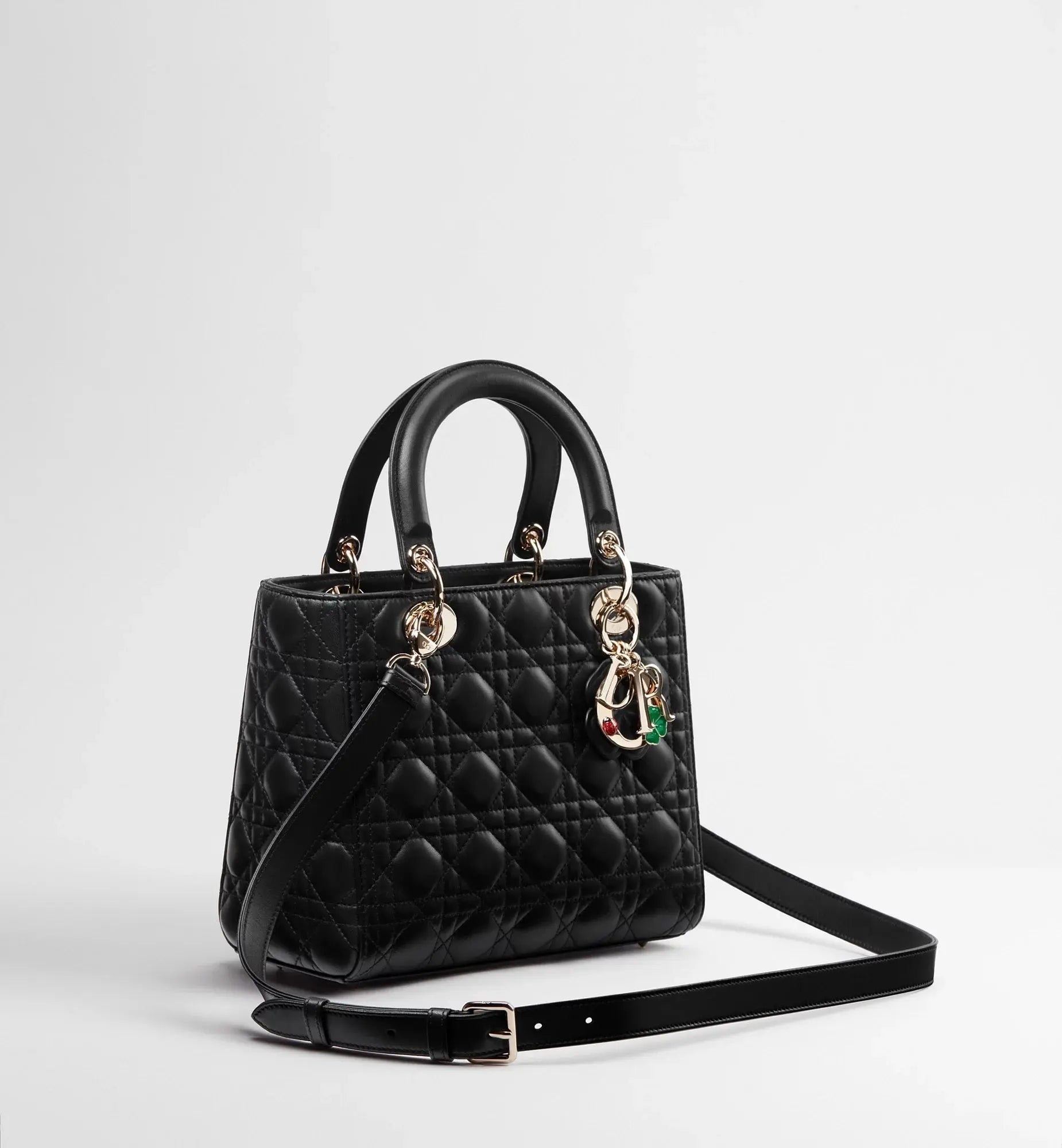 Le sac Lady Dior Medium se réinvente sous l’élan créatif de Jonathan Anderson avec une interprétation fraîche et poétique. Les charms D.I.O.R. en métal doré pâle s’enrichissent d’un charm Dior Clover en cuir, tandis que la lettre O se pare de petits trèfles et d’une coccinelle, symboles porte-bonheur emblématiques de la Maison. Doté d’une bandoulière fine ajustable et amovible, ce modèle iconique se porte à la main pour une allure intemporelle ou en crossbody pour un style résolument contemporain.
