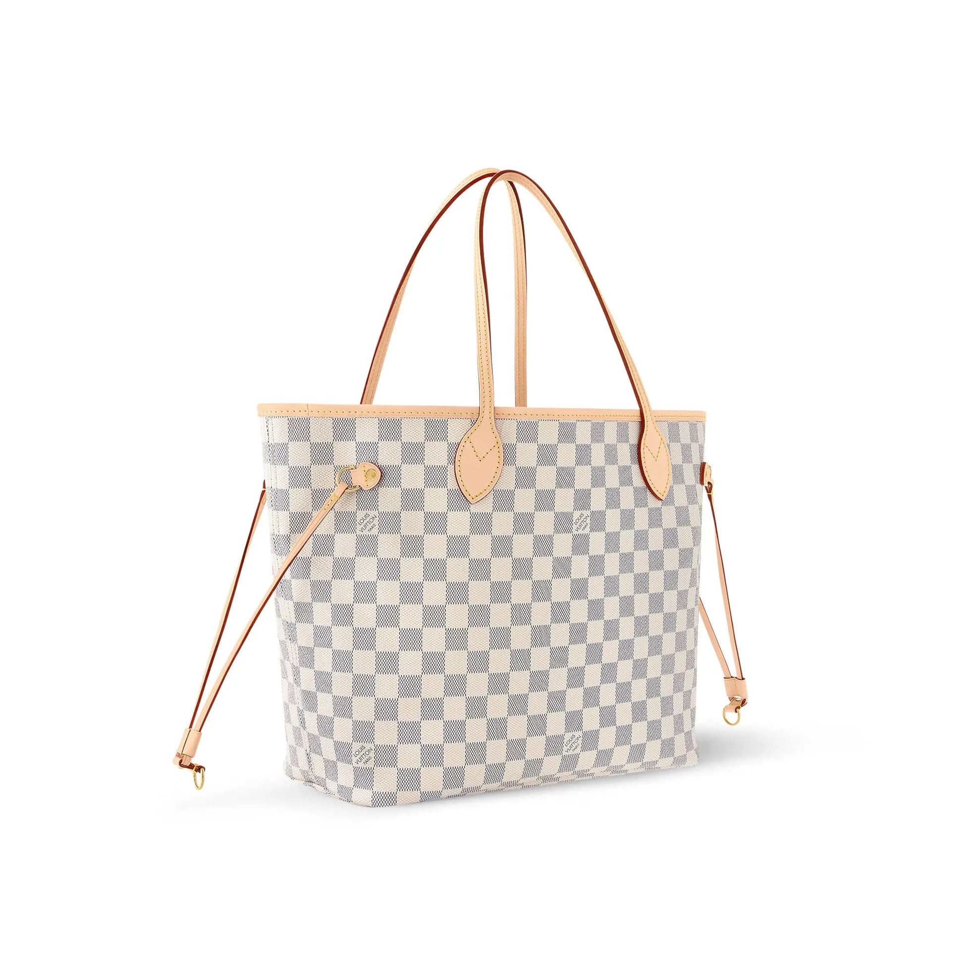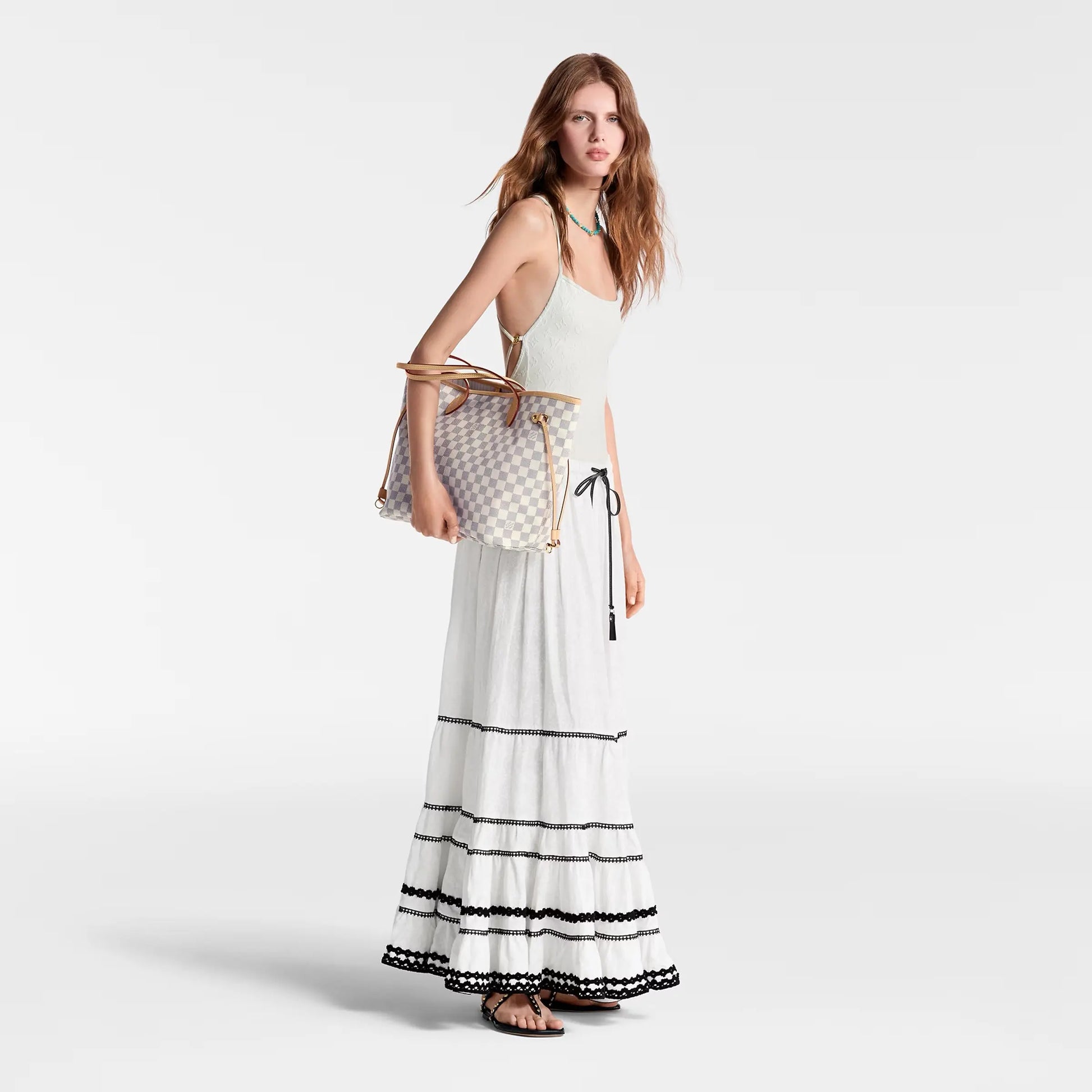 Confectionné en toile Damier Azur et sublimé par une garniture en cuir de vache naturel, ce sac Neverfull MM séduit par son allure fraîche et intemporelle. Spacieux sans être encombrant, il s’adapte facilement au quotidien grâce à ses lacets latéraux, à resserrer pour une silhouette plus structurée ou à desserrer pour un esprit plus décontracté. Les anses fines en cuir assurent un porté confortable à l’épaule ou au bras. L’intérieur, doublé de textile rayé coloré, est complété par une pochette amovible pratique, utilisable seule ou comme rangement supplémentaire.