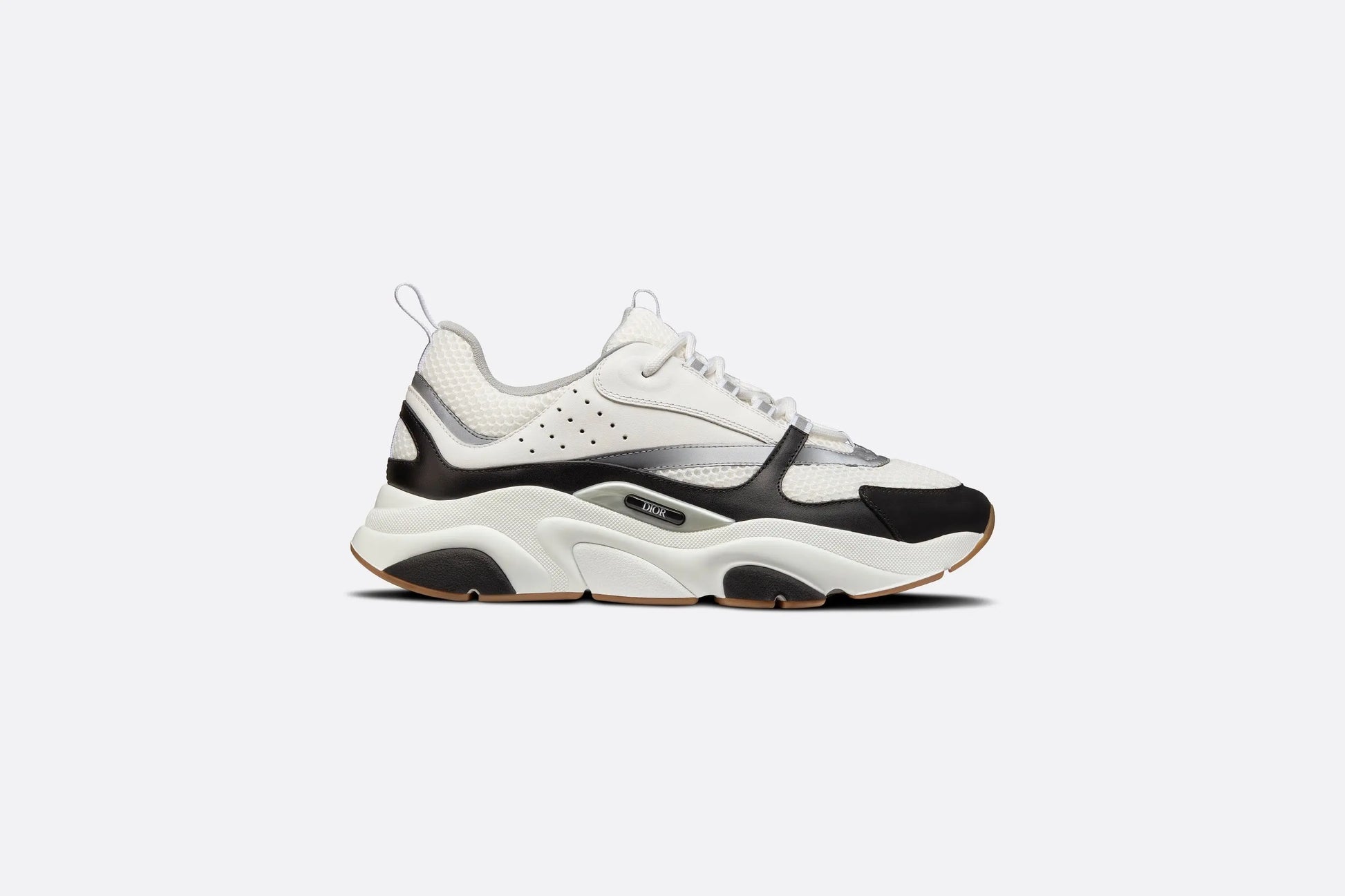 La sneaker B22 revisite la basket chunky dans une version moderne et élégante. Ce coloris associe une maille technique blanche respirante à du cuir de veau lisse noir, gris et blanc, créant un contraste net et graphique. La silhouette joue sur les volumes et les superpositions de matières pour un rendu sportif, tout en restant très raffiné.