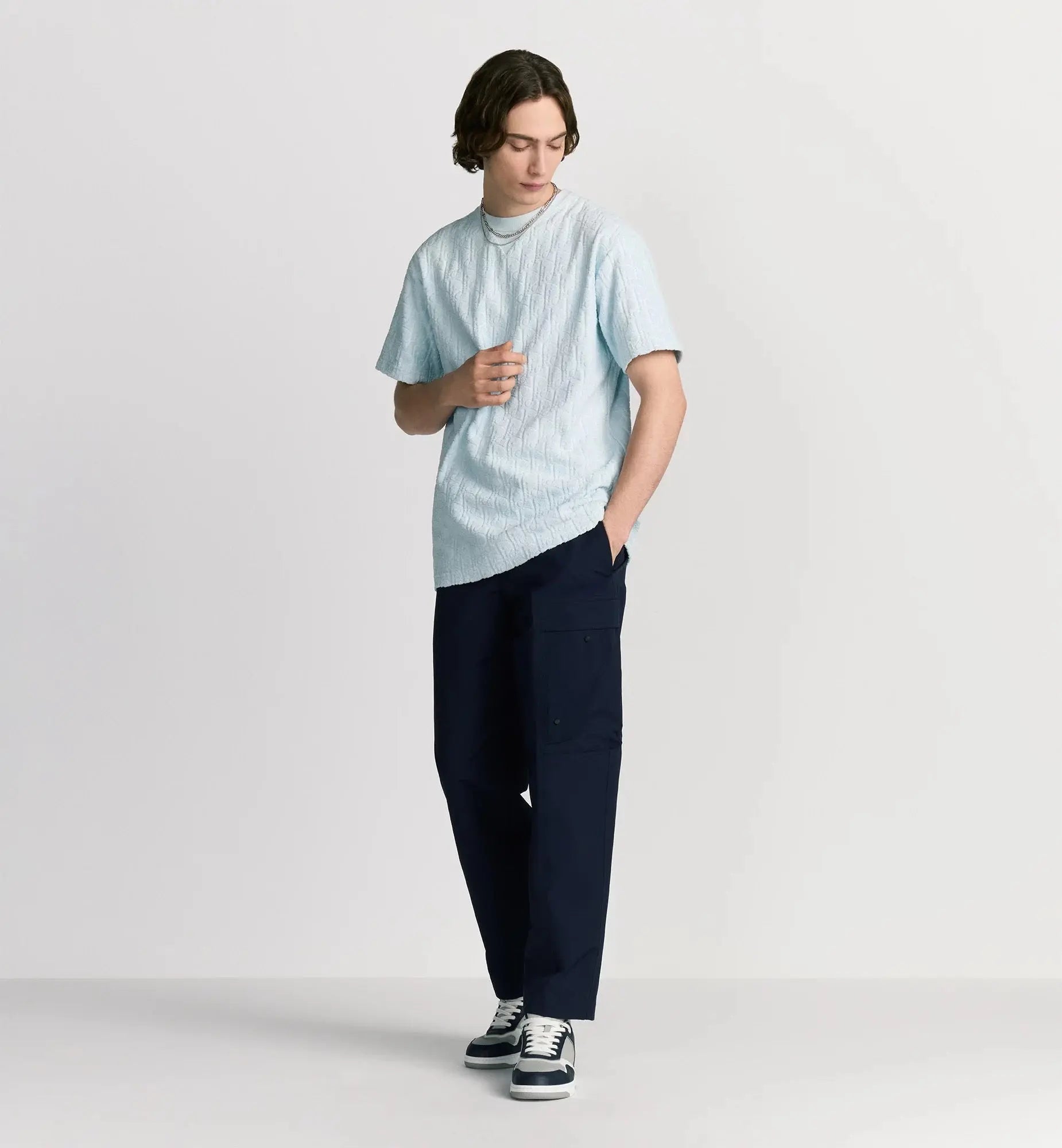 Le t-shirt en coton éponge bleu est une pièce à la fois confortable et emblématique. Il met à l'honneur le motif Dior Oblique emblématique en jacquard ton sur ton sur l'ensemble du vêtement, pour une signature discrète et sophistiquée.